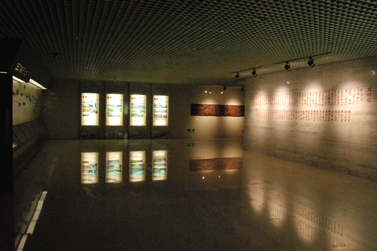 党史方志馆序厅面积约300平方米,由三门峡原貌浮雕背景墙、前言、城市荣誉、三门峡精神、黄庭坚《砥柱铭》、城市名片、大事记及三门峡历史大事浅浮雕等七部分组成。