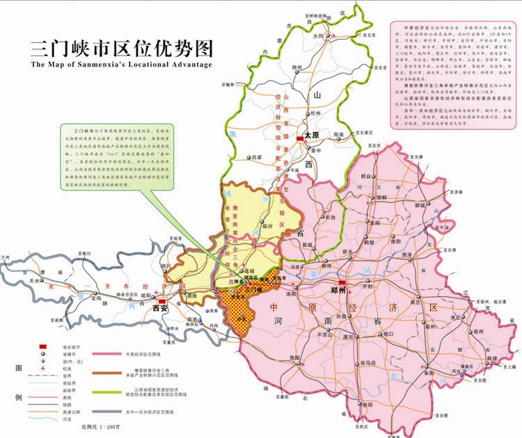 三门峡市位于河南省西部,豫、晋、陕三省交界处,东临洛阳,西接陕西,南连伏牛山与南阳接壤,北隔黄河与山西相望。地处豫晋陕黄河金三角地区的三门峡市,是中原经济区向西辐射的西大门,也是西向欧亚大陆桥、“新丝绸之路经济带”的重要节点城市,具有中原经济区、关中—天水经济区、山西省国家资源型经济转型综合配套改革试验区和豫晋陕黄河金三角承接产业转移示范区“3+1”政策叠加优势。