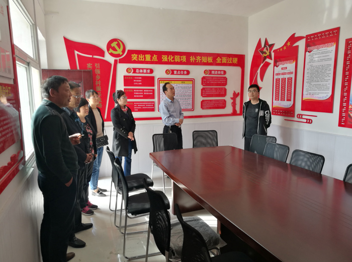 (5月9日下午,市委党史方志办主任郝建伟带领帮扶责任人到清泉沟村开展帮扶工作。图为郝主任一行参观清泉沟村党员活动室。王卓 摄)