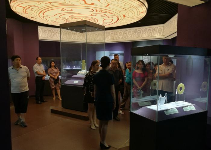 (8月7日下午,市委党史方志办主任郝建伟带领全办党员干部到三门峡市虢国博物馆参观学习。图为参观“美玉灼灼”展览。)