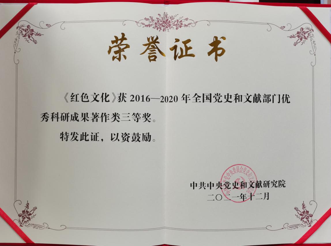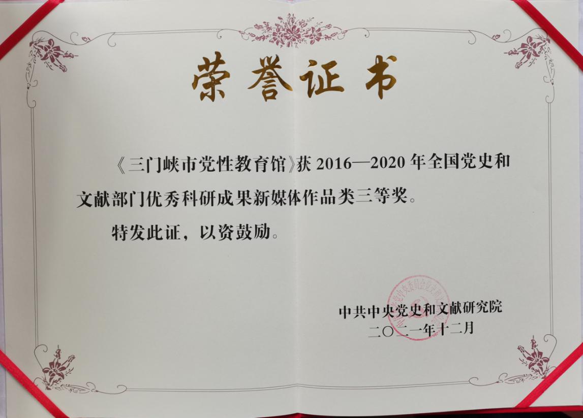 近日,中央党史和文献研究院对2016-2020年全国党史和文献部门优秀科研成果进行表彰,三门峡市有两项成果获得殊荣。其中,市委宣传部和市委党史方志办联合编写的《文化三门峡》系列丛书之《红色文化》获著作类三等奖,市委党史方志办与三门峡广播电视台联合制作的《三门峡市党性教育馆》网上展馆专题片获新媒体作品类三等奖。