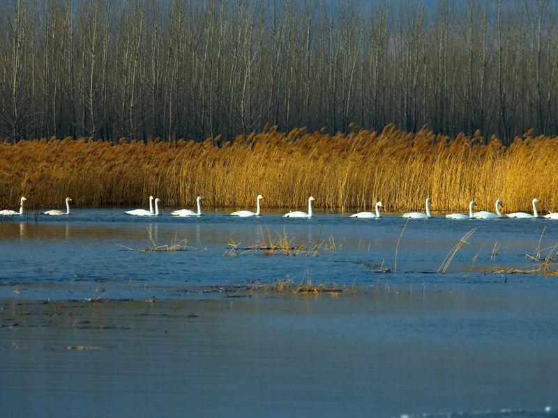 大天鹅是保护区三门峡段的重要保护物种,主要栖息在灵宝稠桑、后地、冯佐及三门峡市区天鹅湖、王官等水面宽阔、食物充足、环境安全的浅水水域。每年11月至翌年3月,都有上万只大天鹅在这里越冬,占整个河南省越冬天鹅数量的95%以上。