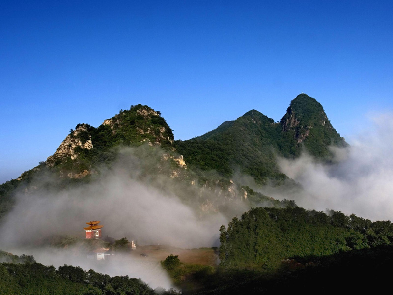 熊耳山雄伟险峻、伟岸挺拨、高耸入云。登上海拔1569米的主峰,但见云遮雾罩,或玉带缠腰,或桂冠戴顶,气势非凡;头天门、二天门、三天门峭拔如削,极其雄险;龙潭水深10丈有余,自上而下飞瀑清泉,堪称奇秀;独木桥悬于绝壁间,经年累月不见朽迹,相传为神人架设,游人无法接近。通天洞平直,进洞后可见蓝天白云;风洞中的冰柱至七月炎夏不融,八月积雪仍存,素有“熊耳不墨千秋画,白云积雪映仙境”之称。